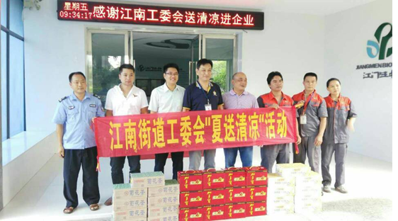 2017年7月14日,江門市江南街道工委干部職工冒著高溫酷暑,深入到企業(yè)第一線,開展“夏日炎炎送清涼、人文關(guān)懷促和諧”活動(dòng),給堅(jiān)守崗位的生產(chǎn)一線員工送上了絲絲涼意。