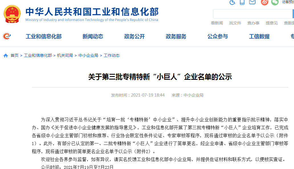 專精特新企業(yè)是指具有“專業(yè)化、精細化、特色化、新穎化”特征的中小企業(yè),而國家級專精特新“小巨人”是專精特新企業(yè)的最高榮譽稱號,從省級專精特新“小巨人”企業(yè)中篩選,經國家工信部審核確認后發(fā)布。