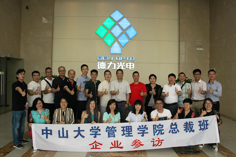 2016年6月4日,中山大學(xué)管理學(xué)院總裁班學(xué)員齊聚德力光電,在總經(jīng)理王非的帶領(lǐng)學(xué)員們先后參觀了員工康樂中心、車間以及展廳,并進行了座談會。
