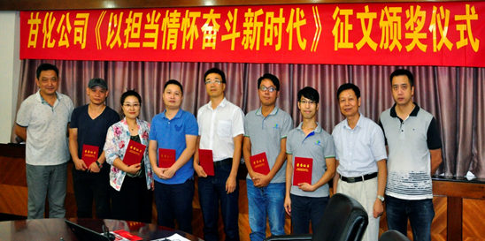 2019年8月30日下午,在甘化大廈15樓會議室,公司黨委、工會舉辦了《以擔(dān)當(dāng)情懷奮斗新時代》獲獎?wù)魑念C獎儀式。儀式由黨委書記、工會主席方小潮主持。公司各支部委員、工會委員和征文作者共16人參加了會議。本次活動共收到征文11篇,參賽征文經(jīng)專業(yè)評委評選,獲獎8篇。